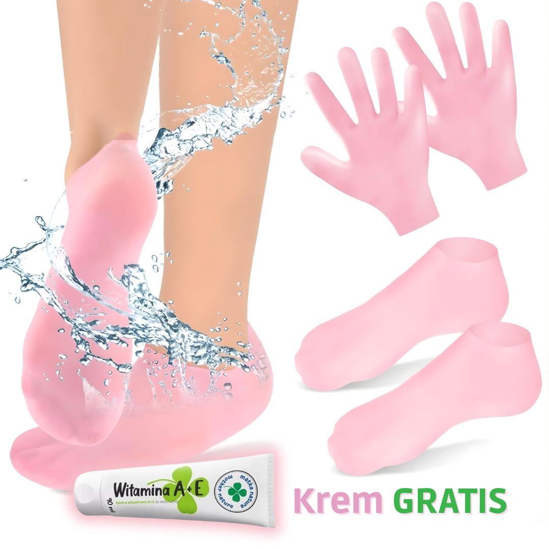Wystarczy posmarować suche miejsce kremem regenerującym następnie założyć rękawiczki lub skarpetki silikonowe i GOTOWE